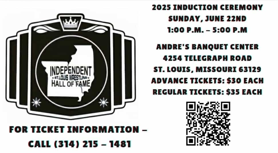 St. Louis Independent Wrestling Hall of Fame takes place this Sunday, June 22nd at Andre’s Banque Center , 4254 Telegraph Rd. St Louis, Missouri. Advance tickets $30, Regular tickets $35 each. Tickets can be purchased using the QR card in the graphic below.