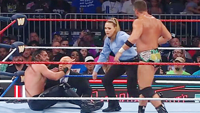 Rollins appeared to injure his knee after an awkward landing on a springboard maneuver from the second rope. After a brief ringside consultation with Paul Heyman and the referee, Knight capitalized with a BFT to secure the win. What followed was an unplanned shift in the evening’s program.
