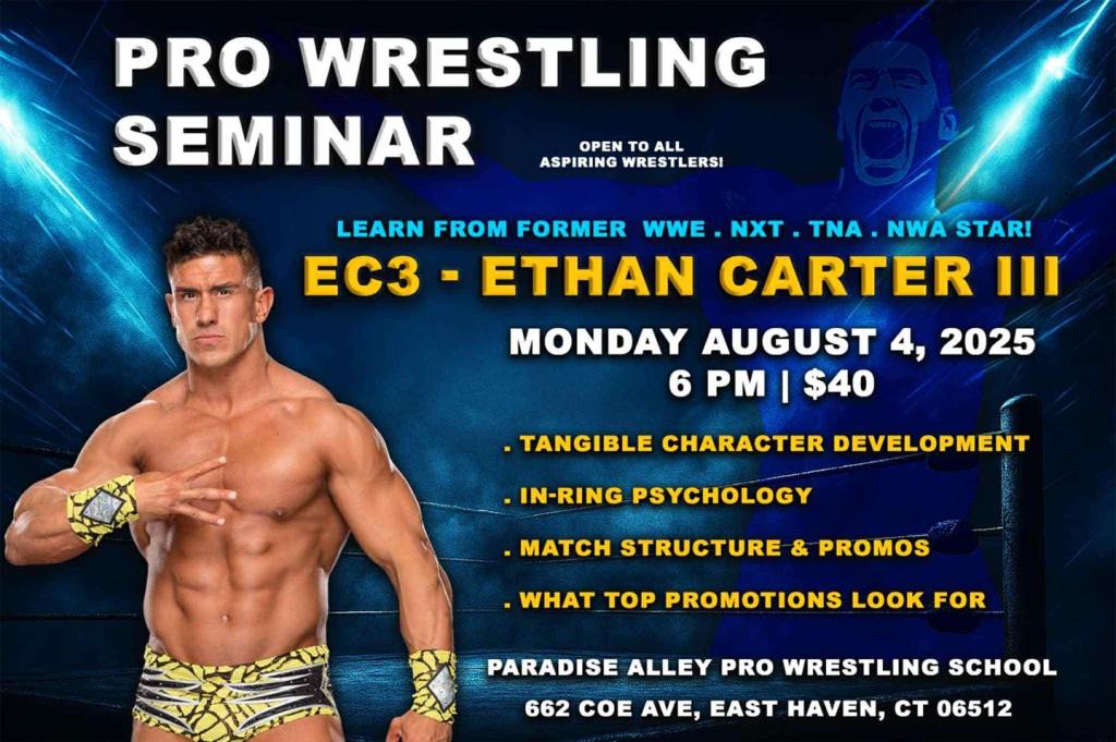 On Monday, August 4th, 2025 at 6 PM, EC3, known for his work in WWE, Impact Wrestling, and NWA—will be appearing at the PAPW Training Facility, located at 662 Coe Avenue in East Haven, Connecticut. The seminar is priced at $40, offering participants an affordable and rare chance to learn directly from a decorated veteran of the squared circle.