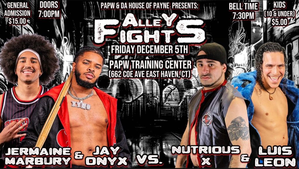 Paradise Alley Pro Wrestling & Da House of Payne presented Alley Fights. The event took place Friday, December 5th at the Paradise Alley Pro Wrestling Training Facility in East Haven, Connecticut. It was taped for both YouTube and for WON Sports which can be watched on the #StreamOnABudget app on Roku or WON New York online.